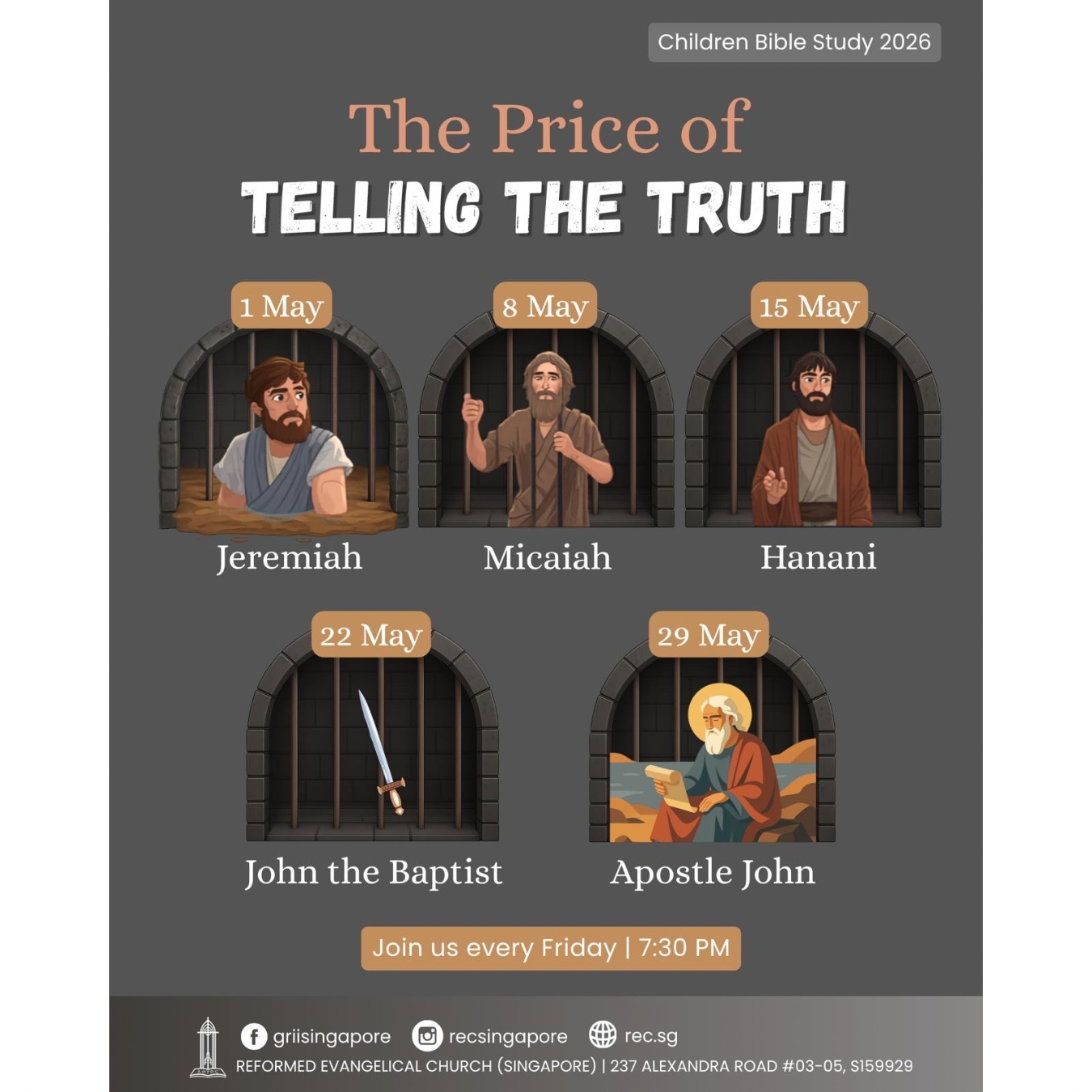 Kelas-kelas Sekolah Minggu diadakan bagi anak-anak berusia 2-12 tahun bersamaan dengan Ibadah Minggu Sore.