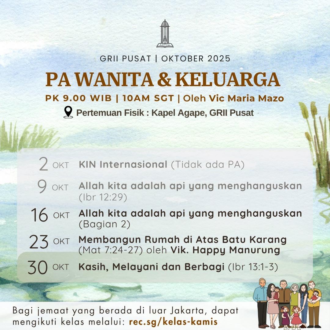 Kelas Kamis/PA Wanita & Keluarga bisa diikuti secara live streaming melalui Zoom Meeting (meeting room dibuka mulai pk 9.45am waktu Singapura/pk 8.45am WIB).