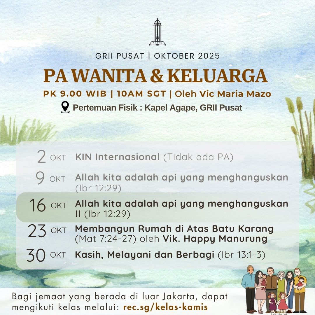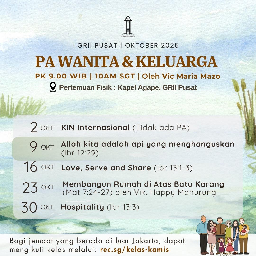 Kelas Kamis/PA Wanita & Keluarga bisa diikuti secara live streaming melalui Zoom Meeting (meeting room dibuka mulai pk 9.45am waktu Singapura/pk 8.45am WIB).