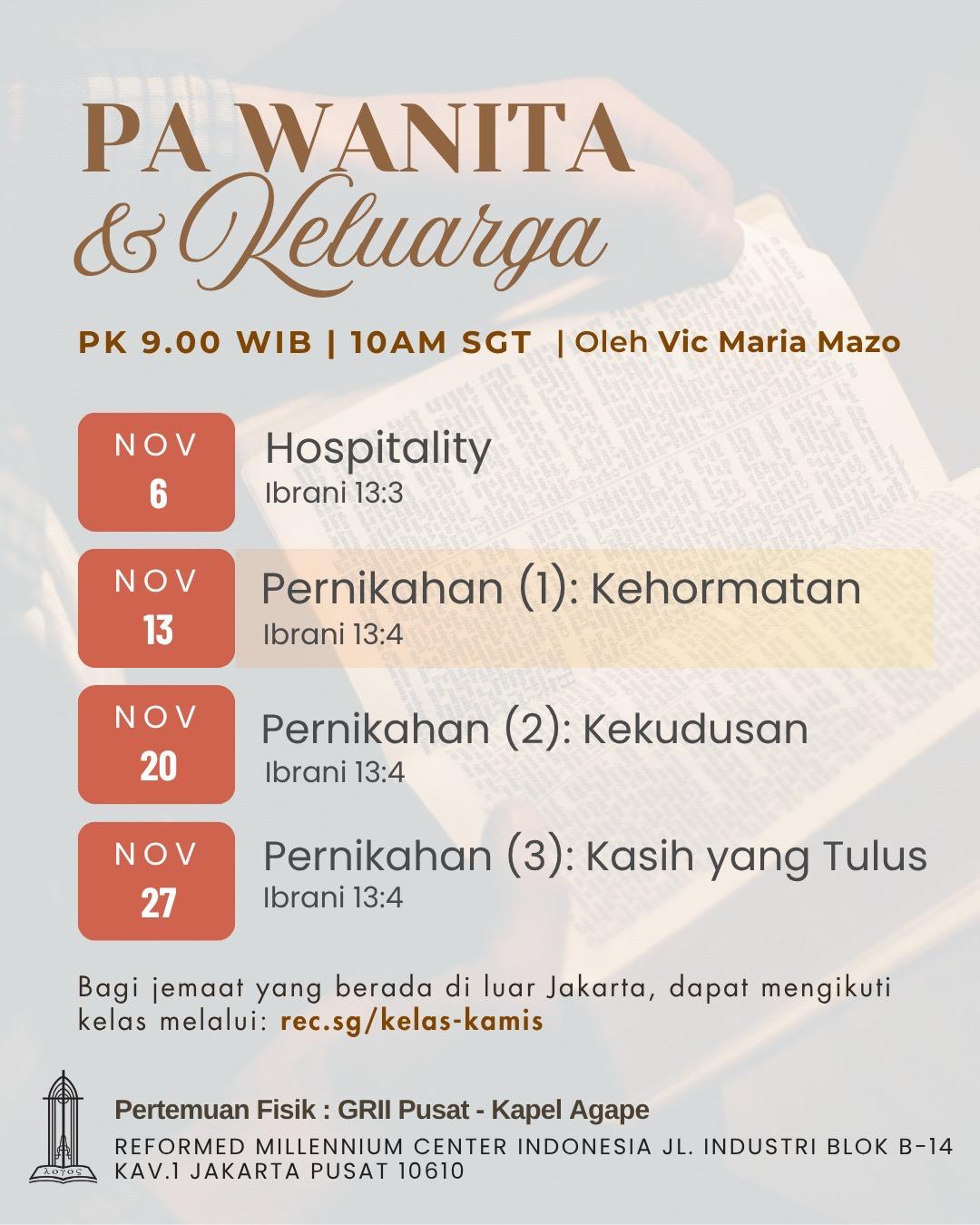 Kelas Kamis/PA Wanita & Keluarga bisa diikuti secara live streaming melalui Zoom Meeting (meeting room dibuka mulai pk 9.45am waktu Singapura/pk 8.45am WIB).